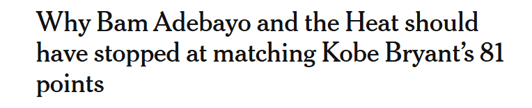 The Athletic名记Amick表示,出于对科比的尊重,热火应该在阿德巴约超过科比前换下他。 Amick写道:“出于人性使然,他(科比)的离世让每一个他最珍贵的成就都变得更加厚重,也让人们觉得应当以某种特别的方式来对待这些成就。阿德巴约砍下高分后,我与一些科比的前同事联系过后得到的反馈,有这种想法的人不止我一个。当然,他无需为此道歉。恰恰相反,完成如此不可思议的壮举理应赢得四面八方的赞誉;毕竟83分就是83分。要是他能早些收手就好了。”